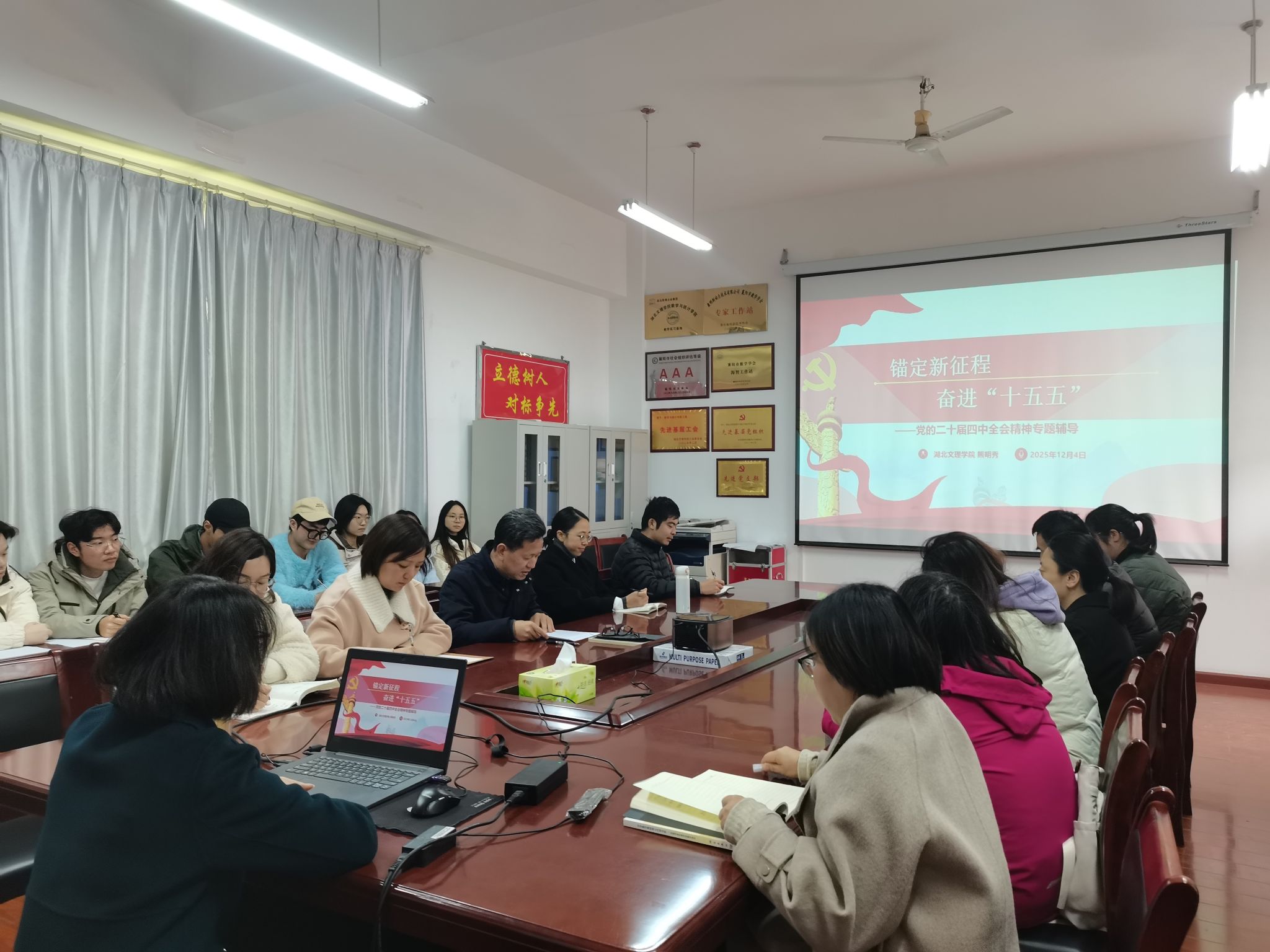举行党的二十届四中全会精神宣讲会,邀请学校学习贯彻党的二十届四中全会精神宣讲团成员、马克思主义学院教授熊明秀作题为《锚定新征程 奋进“十五五”》专题辅导报告。学院领导班子成员、教职工、学生党员、入党积极分子代表参加,宣讲会由学院党委书记袁红星主持。